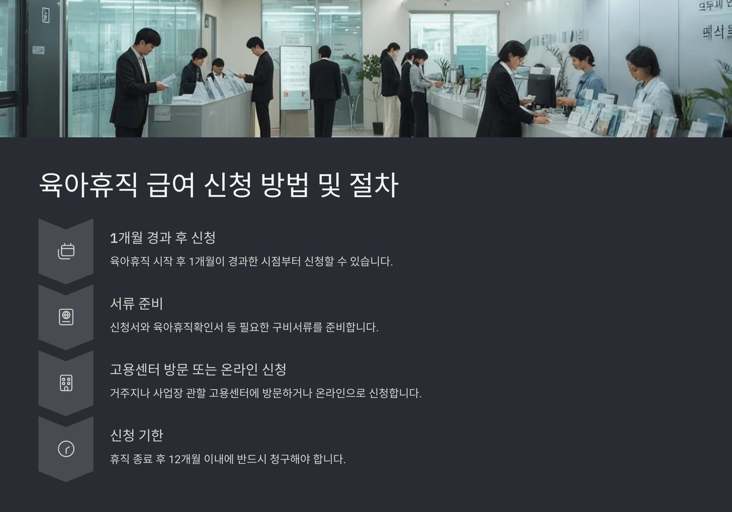 육아휴직 급여는 ‘휴직 시작일 이후’에 신청이 가능해요. 보통 한 달 단위로 급여가 지급되며, 절차는 다음과 같아요: