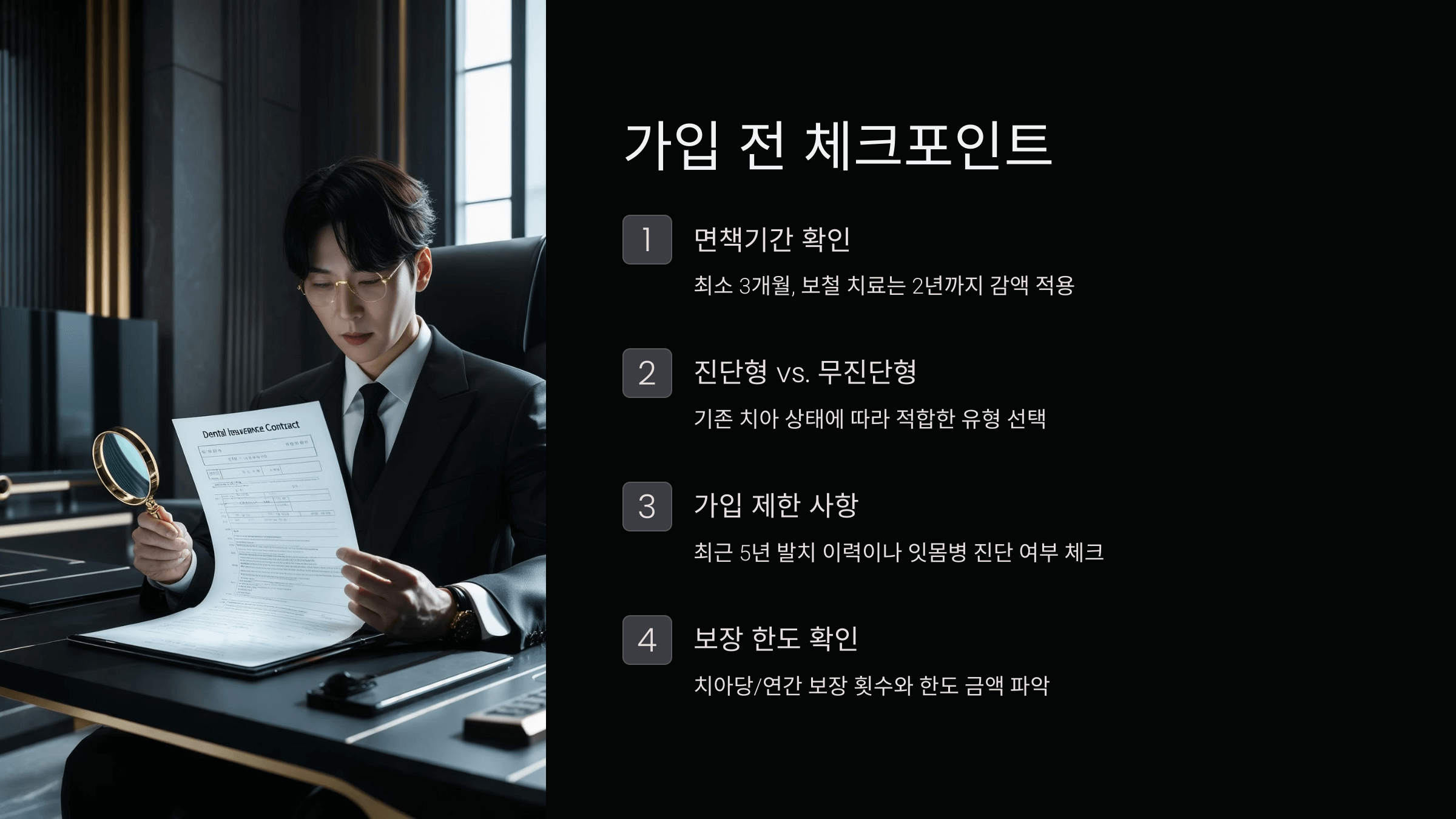 치아보험은 보장 항목이 다양하고 보험사마다 조건도 다르기 때문에, 가입 전에 몇 가지 핵심 포인트를 꼭 체크해야 해요. 이걸 모르고 가입하면 원하는 보장을 못 받거나 보험료만 낭비할 수 있어요.